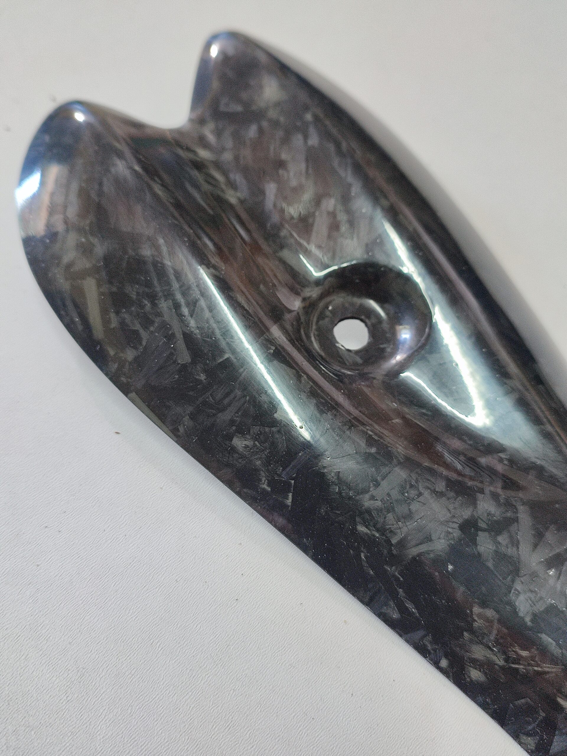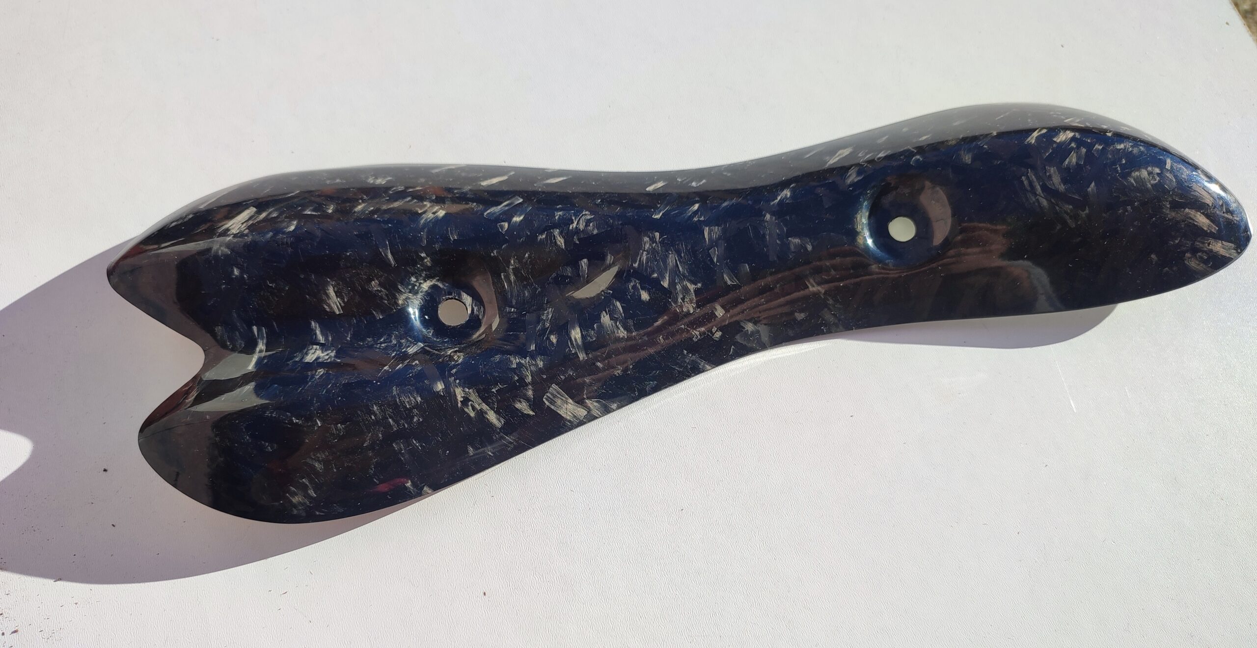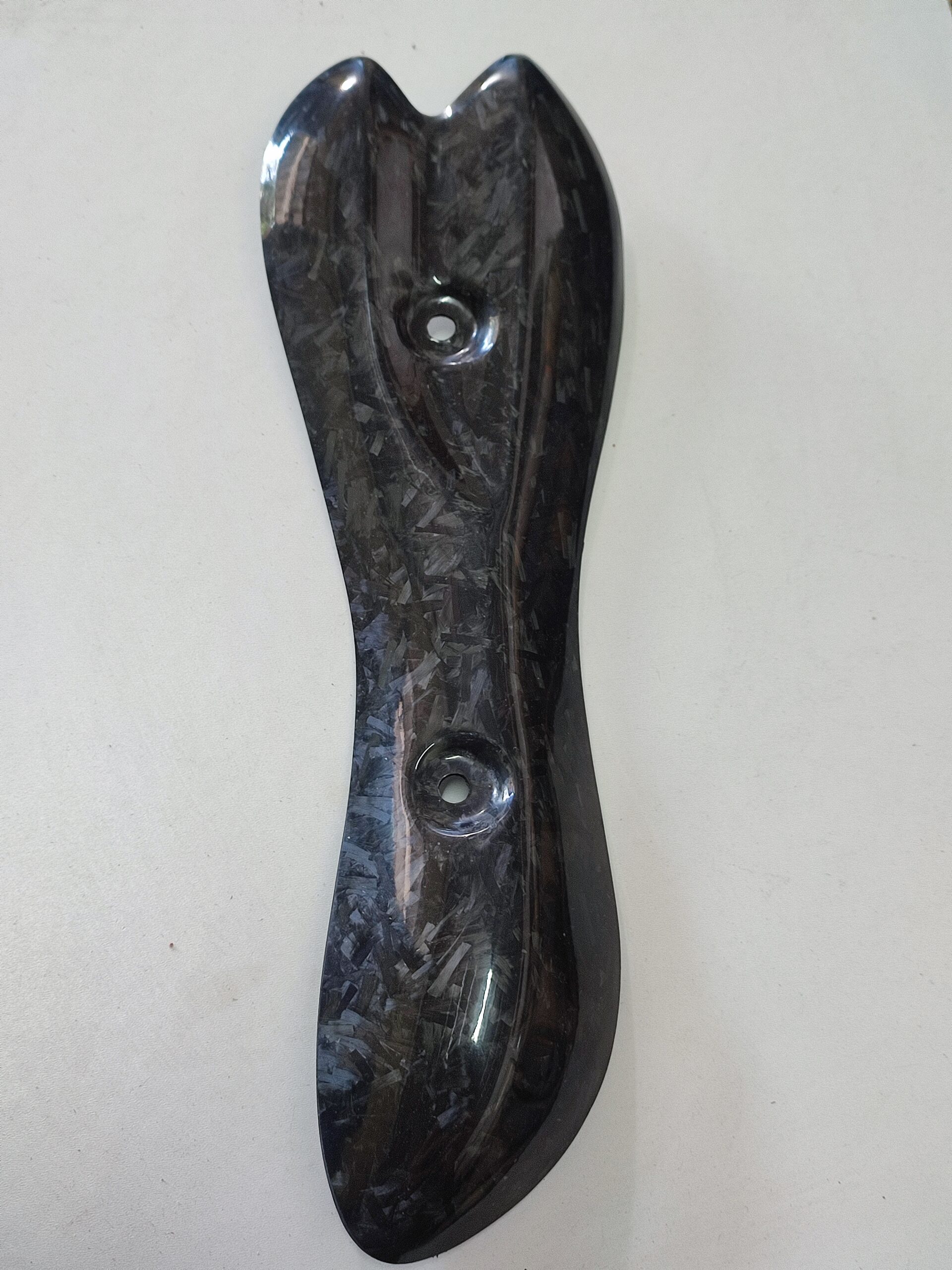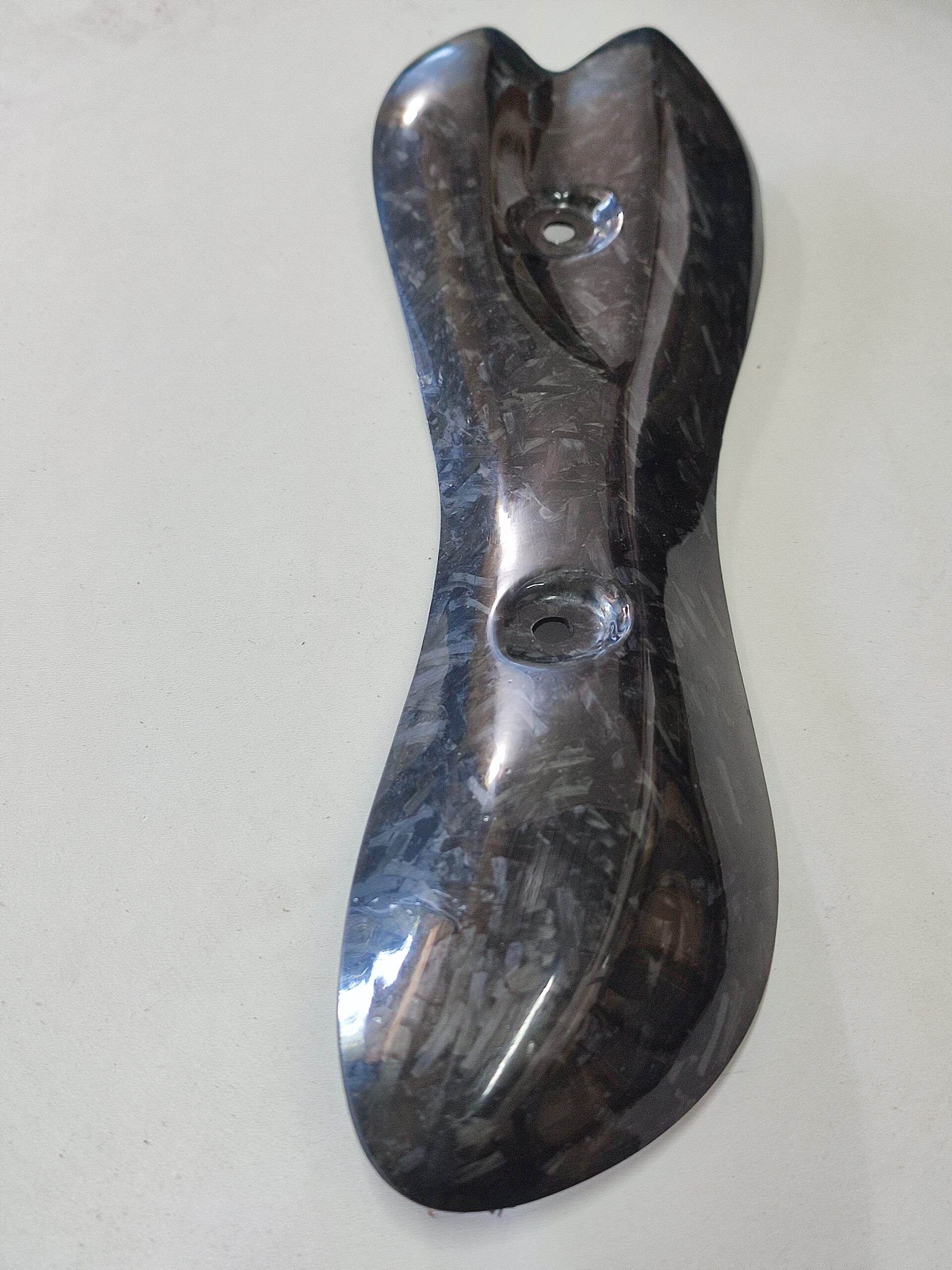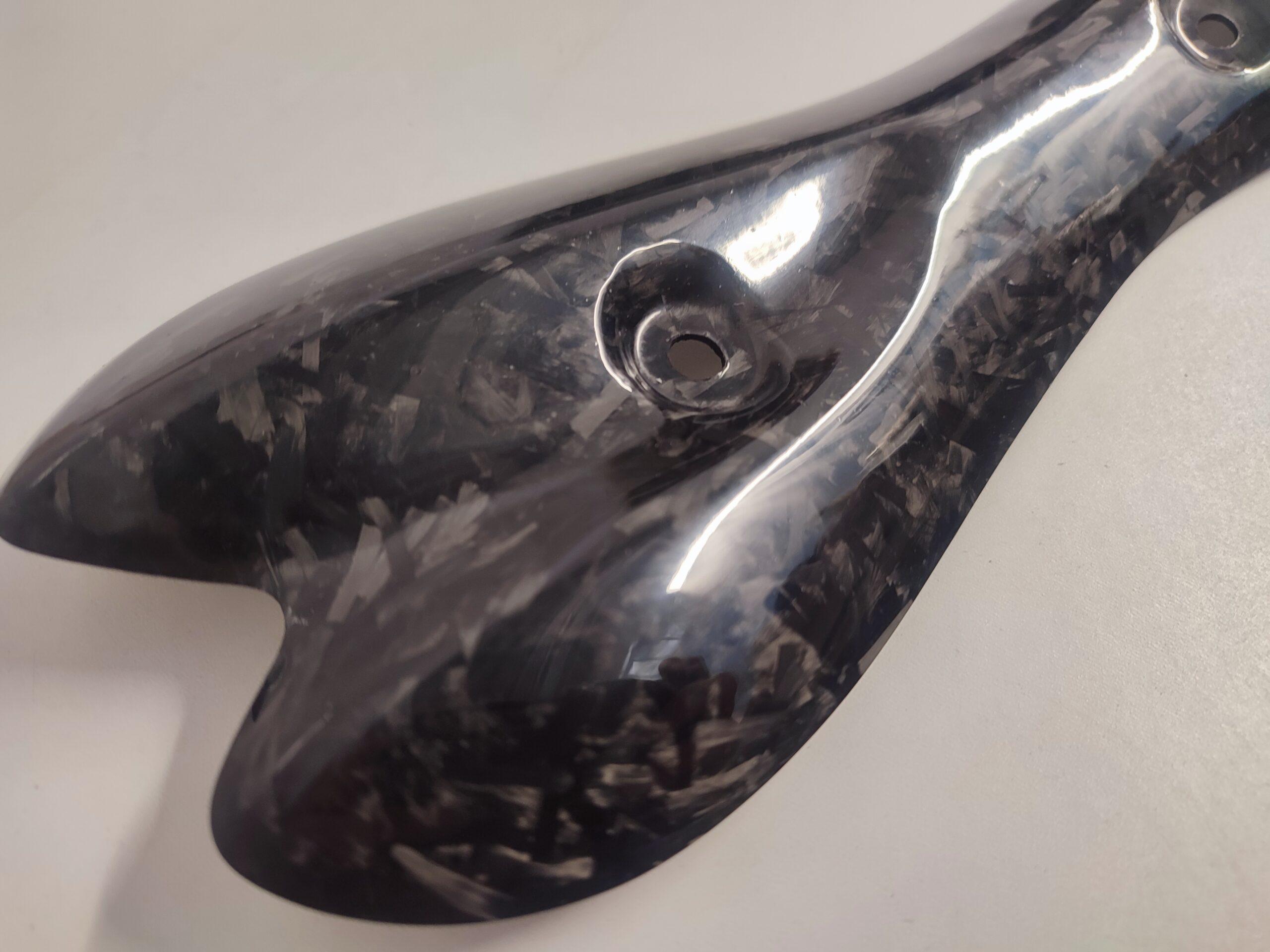 This exhaust shield is made from forced carbon fibre. It is also available in standard 2×2 twill.